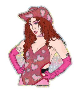 Current Bestseller? The Hot-To-Go Glitter Sticker. It’s a standard vinyl sticker, but to pay homage to Chappell’s glittery costumes, I added sparkles.