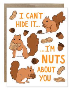 Personal Favorite? The Nuts About You card, because I had so much fun drawing the cute nibbly squirrels. I also can’t help but be proud of myself for the subtle layers in the text, with the nut pun and referencing how squirrels hide their food. It’s just a fun card to express your feelings, and who doesn’t love little furry creatures?
