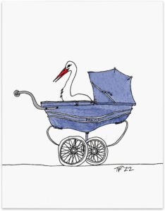 Iconic Selection? A Stork Sitting in a Pram. This humorous and tender nod to new beginnings has been pretty popular. I imagine those prams are impossible to maneuver, but they sure are elegant!