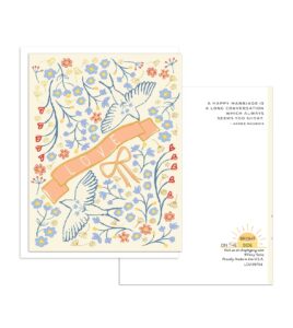 Designer Quote: “I love being inspired by beautiful places and ‘vibes.’ Expect to see more couples wanting to express their personalities to their guests and really focusing on having a ‘fun’ wedding and/or wedding weekend. Having good vibes at an event is important, and it’s important that those vibes carry through the invitation and stationery. You’ll see lots of ‘fun’ elements in our latest offerings — a disco ball, for example, lets guests know to bring their dancing shoes for a night of celebration!” — Gina Peterson, Ginger P. Designs