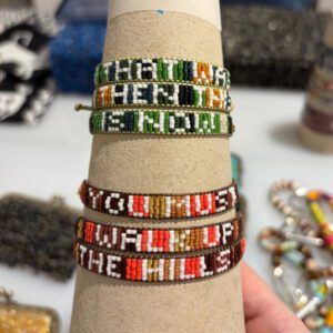 Those who know me know I love seeing the messaging of stationery leap onto other categories, in this case bracelets. But these La Casa beaded babies take an extra-clever approach by spreading out that copy into three-bracelet mini-manifestoes!