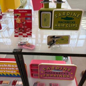 The sardine theme (as well as its brethren, caviar and oysters) is meant to be silly and fun, with a bit of unexpected practicality. Hair clips and earrings from MackBecks are dispensed in tins nearly as elevated as the accessories they dispense.